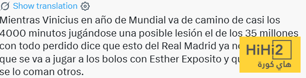 فينيسيوس جونيور في سنة كأس العالم يقترب من لعب ما يقارب 4000 دقيقة، معرضا نفسه لخطر إصابة محتملة بينما لاعب مثل مبابي الذي كلف 35 مليونا وبعد أن ضاع كل شيء يقول إن هذا الأمر في ريال مدريد لم يعد يهمه وأنه سيذهب للعب البولينغ مع إستر إكسبوزيتو ويترك الآخرين يتعاملون مع الفوضى .