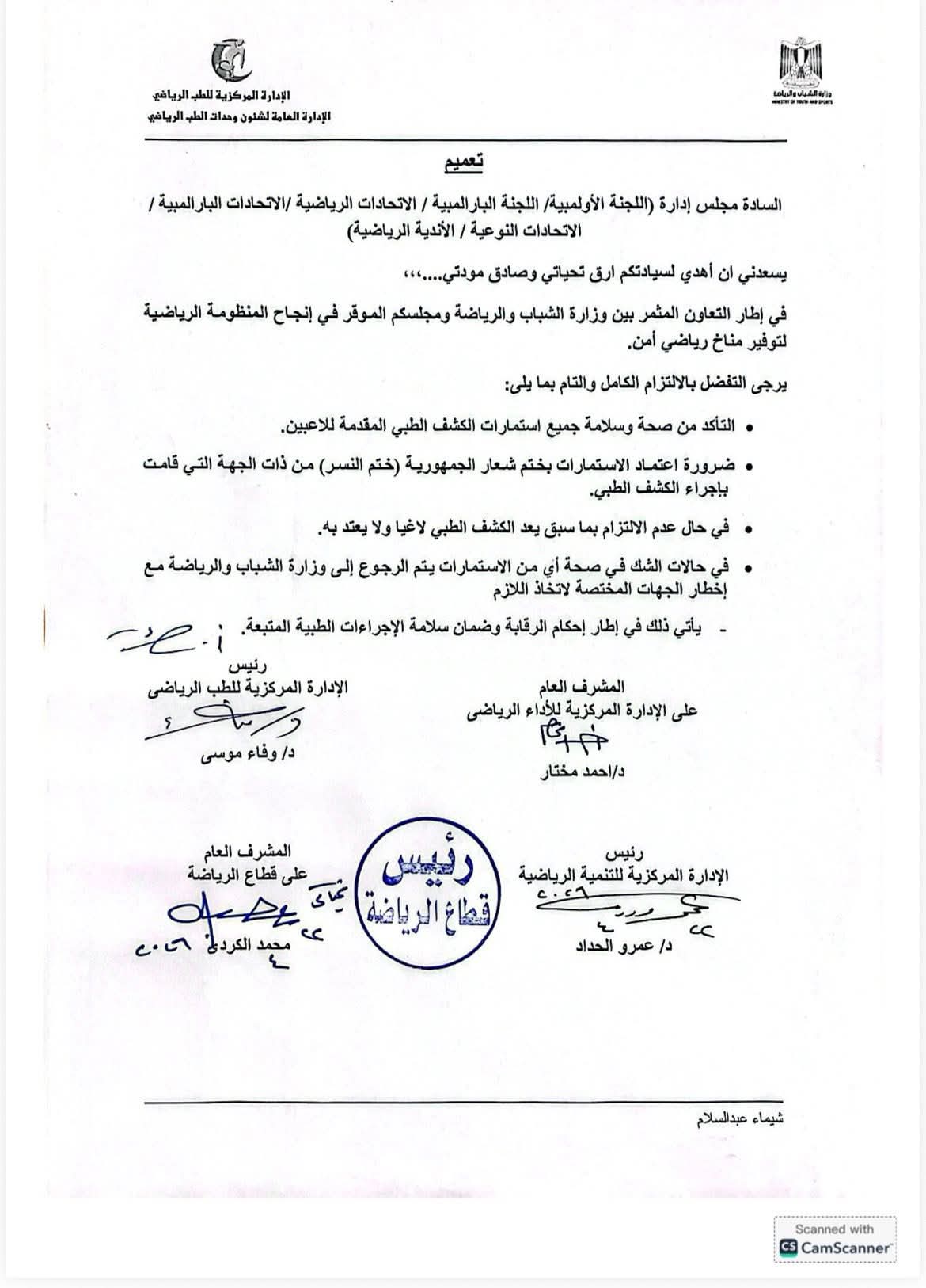 على جانب آخر، أصدرت وزارة الرياضة تعميمًا رسميًا عبر الإدارة المركزية للطب الرياضي، موجهًا إلى اللجنة الأولمبية والاتحادات والأندية، بضرورة الالتزام الكامل بإجراءات الكشف الطبي.