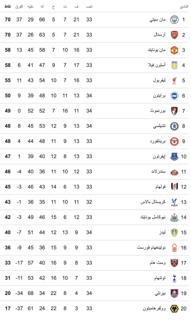 رفع السيتي رصيده من النقاط إلى 70 نقطة في المركز الأول متساويًا مع أرسنال الذي تراجع للمركز الثاني.