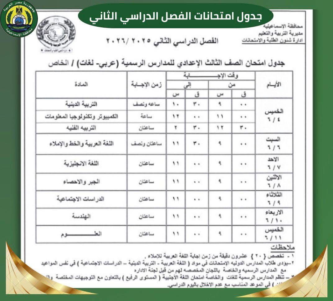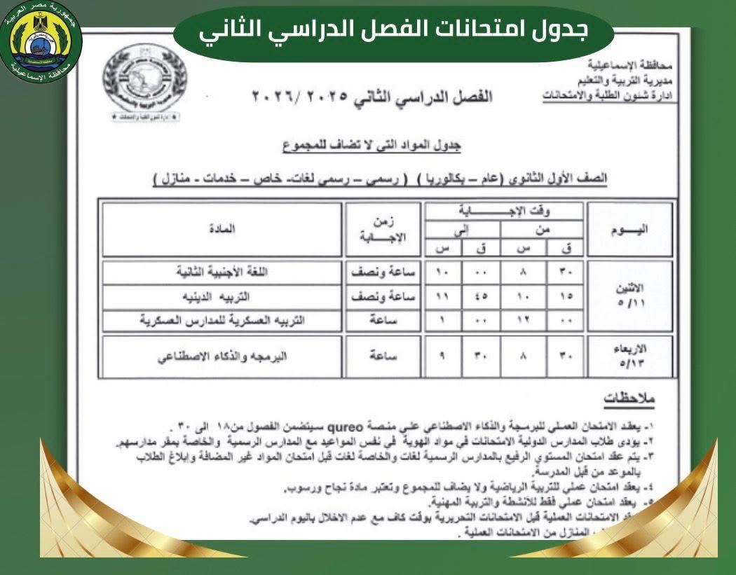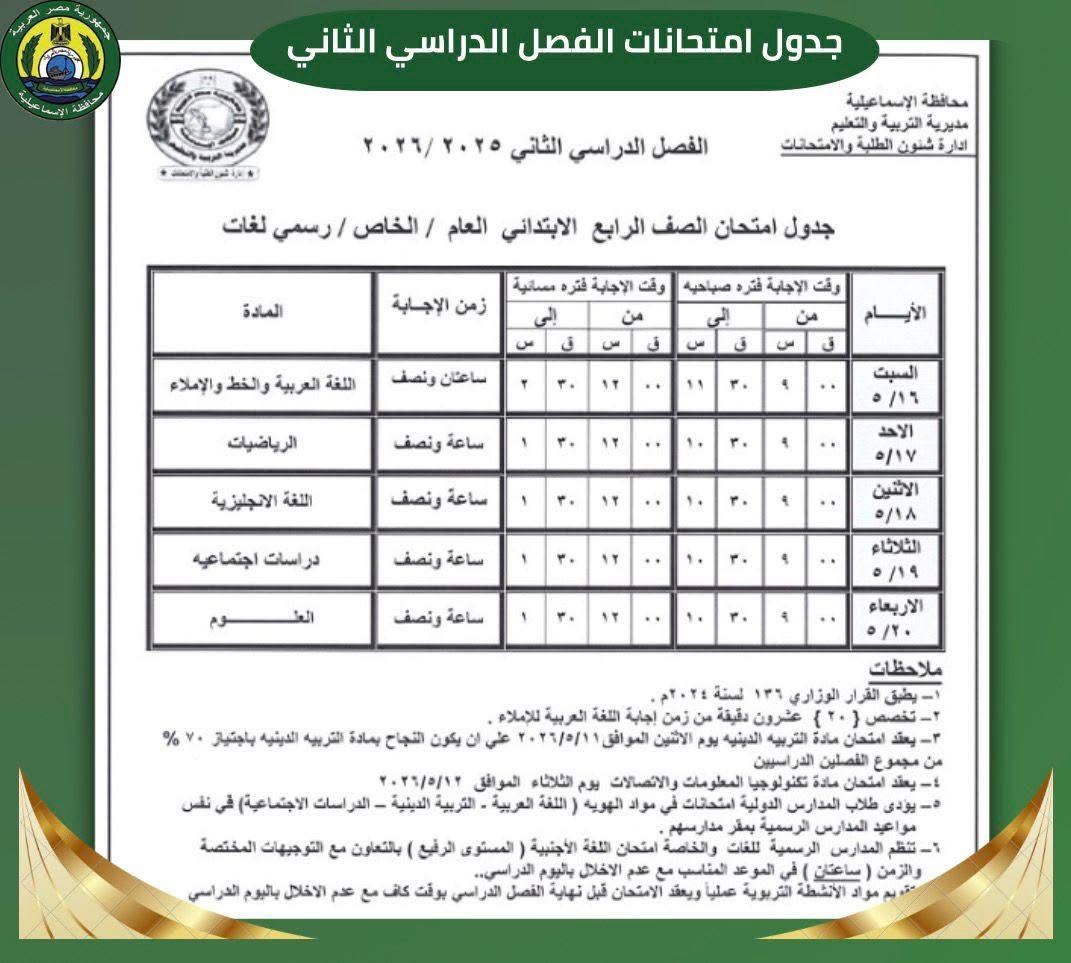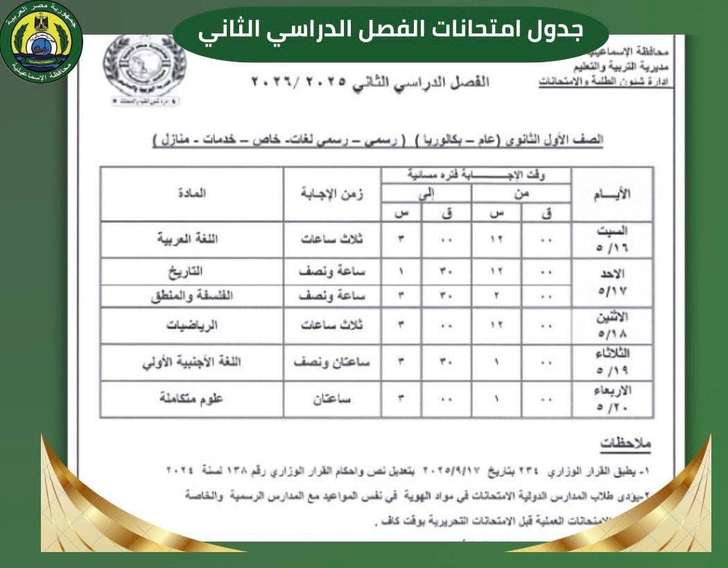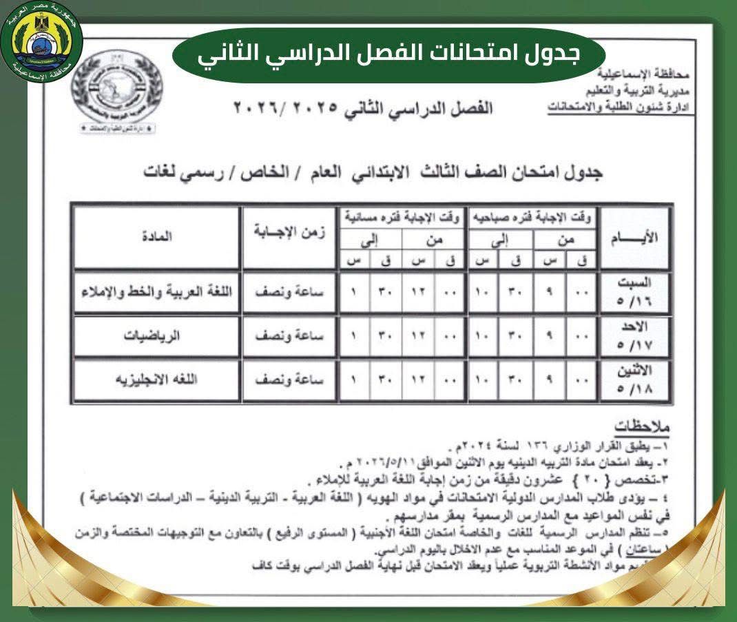 اعتمد اللواء أ.ح نبيل السيد حسب الله محافظ الإسماعيلية، جداول امتحانات الفصل الدراسي الثاني للعام الدراسي ٢٠٢٥ – ٢٠٢٦ ، لصفوف النقل والشهادات المحلية، وذلك حسب الخريطة الزمنية الواردة من وزارة التربية والتعليم والتعليم الفني للعام الدراسي ٢٠٢٥ – ٢٠٢٦.