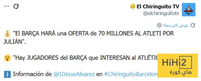 ” برشلونة سيقدم عرضا بقيمة 70 مليون يورو إلى أتلتيكو مدريد من أجل ضم جوليان ألفاريز ” .